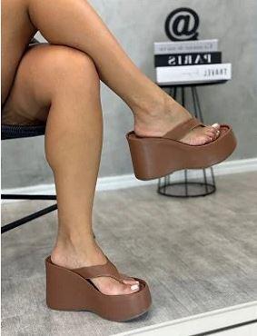 Sandália Anabela, modelo tamanco de dedo, com salto tamanho 10cm atrás e 4cm na frente