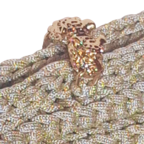 O brilho sutil dos fios dourados traz delicadeza e charme, enquanto o fecho com detalhe de onça adiciona um toque marcante e fashion à peça. Os acabamentos em dourado completam o visual, deixando a bolsa ainda mais refinada.