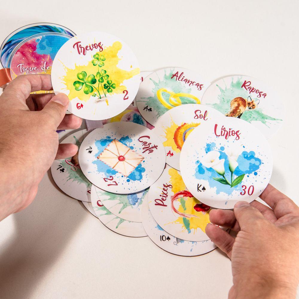 O Toque de Aquarela Lenormand traz um charme especial para as leituras. Com cartas em formato circular, este baralho une a tradicional simbologia do Lenormand à suavidade das aquarelas, criando uma experiência visual única e envolvente. Cada lâmina foi pensada para oferecer leveza, fluidez e um toque artístico que transforma cada tiragem em um momento ainda mais especial.